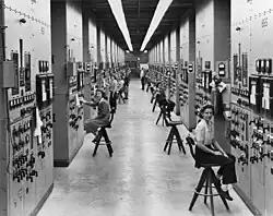 Mudança de turno na instalação de enriquecimento urânio Y-12 em Oak Ridge. Em maio de 1945, 82 mil pessoas foram empregadas no Clinton Engineer Works.[68]