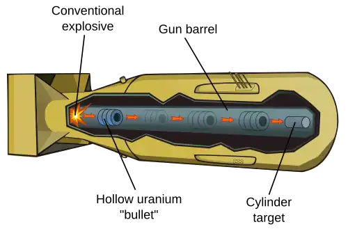 Dois tipos de bomba atômica foram desenvolvidos durante a guerra. Um tipo relativamente simples de arma de fissão, a Little Boy, foi feito utilizando urânio-235, um isótopo que representa apenas 0,7% do urânio natural. Uma vez que é quimicamente idêntico ao isótopo mais comum, o urânio-238, e tem quase a mesma massa, o urânio-235 revelou-se difícil de separar do urânio-238. Três métodos foram utilizados para o enriquecimento do urânio: eletromagnético, gasoso e térmico. A maior parte deste trabalho foi realizado em Oak Ridge, Tennessee.