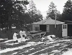 Por causa do segredo, Los Alamos era referido como "Site Y" (local Y) ou "the Hill" (a Colina).[88] Certidões de nascimento dos bebês nascidos em Los Alamos durante a guerra indicavam seu local de nascimento como PO Box 1663 em Santa Fé.[89] Inicialmente Los Alamos era para ter sido um laboratório militar com Oppenheimer e outros pesquisadores comissionados para o exército. Oppenheimer chegou a encomendar para si um uniforme de tenente-coronel, mas dois físicos fundamentais, Robert Bacher e Isidor Isaac Rabi, rejeitaram a ideia. Conant, Groves e Oppenheimer, em seguida, conceberam um compromisso de que o laboratório seria operado pela Universidade da Califórnia, sob contrato com o Departamento de Guerra.[90]
