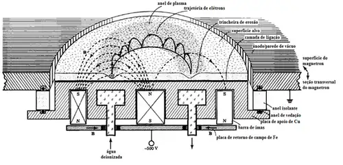 Um importante avanço tecnológico aplicado à técnica de sputtering é o magnetron sputtering, que consiste em introduzir um campo magnético na descarga através de um conjunto de ímãs permanentes colocados internamente ao catodo de forma a gerar um campo magnético com forte componente paralela à superfície do substrato.