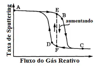 A figura 'Comportamento típico do processo de sputtering reativo, com vazão do Argônio fixa' mostra que, durante a deposição do alvo metálico em atmosfera de Argônio puro (A), a taxa de sputtering é alta. Conforme o fluxo do gás reativo é aumentado a taxa permanece alta até o momento em que a taxa de adsorção do gás reativo excede a taxa de sputtering. A partir deste ponto (B) o alvo torna-se envenenado com o gás reativo, fazendo com a taxa de sputtering caia a um nível bem menor (C). Se agora o fluxo de gás reativo for diminuído, a condição de alvo envenenado persiste até o ponto D, onde o alvo começa a ser “limpo” e a taxa de sputtering começa a ficar maior que a taxa de adsorção. Na área de histerese não é possível controlar a composição do filme, visto que uma ligeira diminuição no fluxo do gás reativo no ponto F pode gerar um retorno ao ponto E. [2] Para um melhor entendimento deste fenômeno é preciso um estudo mais aprofundado no Modelo de Berg.[8]