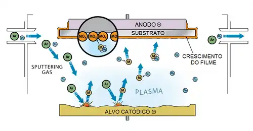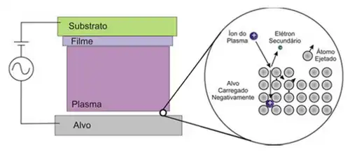 No processo de sputtering os átomos são removidos da superfície de um material denominado alvo através de transferência de momento sustentável de uma partícula, através de bombardeamento energético de um íon gasoso acelerado a partir de um plasma, onde estão presentes elétrons, íons e espécies neutras. Para obter-se a deposição por sputtering, é necessário que a câmara de processos esteja em vácuo. [3][7]