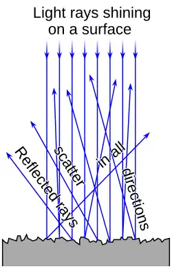 Reflexão difusa é a reflexão de luz a partir de uma superfície de tal forma que um raio incidente se reflete em muitos ângulos em vez de em apenas um ângulo, tal como no caso de reflexão especular. Uma superfície difusa ideal iluminada refletindo terá igual luminosidade de todas as direções em torno da superfície ( vide sessão: Lei do cosseno de Lambert).[1] Uma superfície construída a partir de um pó não-absorvente, tais como gesso, ou a partir de fibras, tais como papel, ou a partir de um material policristalino tal como mármore branco, reflete a luz difusa com grande eficiência ( vide sessão: Objetos Coloridos). Muitos materiais comuns exibem uma mistura de reflexão especular e difusa ( vide sessão: A absorção e a reflexão da luz na natureza).[2]
