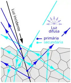 Em geral, a interface entre as partículas pequenas que constituem muitos materiais é irregular em uma escala comparável ao comprimento de onda da luz, de modo que a luz difusa é gerada em cada interface, em vez de um único raio refletido.[12]