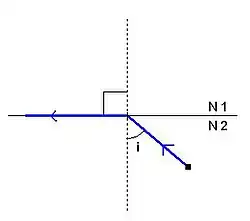 Uma situação em que o feixe de luz refratado será quase paralelo à superfície. Aumentando um pouco mais o ângulo de incidência (i), até chegar ao ângulo critico o feixe refratado desaparece e toda a luz passa a ser refletida. Esse fenômeno chama-se reflexão total. Para que isso aconteça, é preciso que a luz seja proveniente de um meio mais refringente em relação ao outro (N1 > N2).[1]
