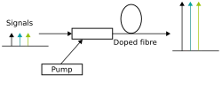 - Uma maneira de adicionar intensidade ao sinal óptico é usar um pré-amplificador óptico, por exemplo um amplificador de fibra. Infelizmente, amplificadores tem o efeito de adicionarem algum nível de ruído. Se o ruído do sinal óptico for contaminado por alguns níveis de ruído do pré-amplificador, a Relação sinal-ruído da detecção pode ser aumentada com o uso de um outro amplificador (principalmente se principal fonte de ruído for o detector)[8].