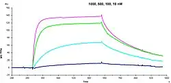 - ↑ Rich, RL; Myszka, DG (fevereiro 2007). «Higher-throughput, label-free, real-time molecular interaction analysis». Analytical Biochemistry. 361 (1): 1–6. PMID 17145039. doi:10.1016/j.ab.2006.10.040