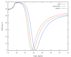 Uma das primeiras aplicações comuns da espectroscopia de ressonância plasmônica de superfície foi a medição da espessura (e índice de refração) de nanofilmes automontados adsorvidos em substratos de ouro. As curvas de ressonância mudam para ângulos mais elevados à medida que a espessura do filme adsorvido aumenta. Este exemplo é uma medição de 'SPR estático'.