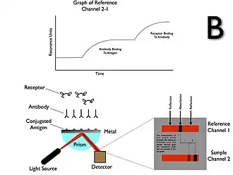 O sinal SPR detectado é uma consequência do 'acoplamento' eletromagnético da luz incidente com o plasmon superficial da camada de ouro. Esta interação é particularmente sensível às características da camada na interface ouro–solução, que normalmente tem apenas alguns nanômetros de espessura. Quando as substâncias se ligam à superfície, alteram a forma como a luz é refletida, causando uma mudança no ângulo de reflexão, que pode ser medido como um sinal em experimentos SPR. Uma aplicação comum é medir a cinética de interações anticorpo-antígeno.