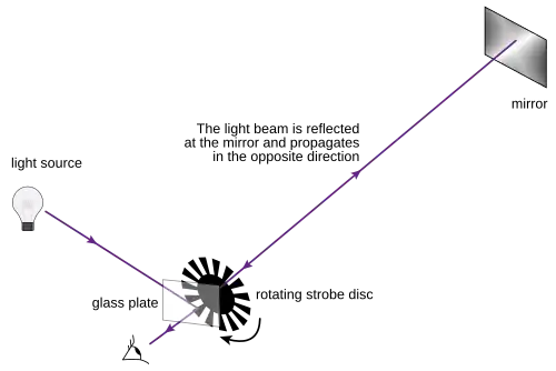 Em 1849, o físico francês Armand-Hyppolyte-Louis Fizeau (1819-1896) determinou a velocidade da luz no ar realizando o experimento conhecido como Roda de Fizeau ou Experimento da Roda Dentada. A experiência consistia em colocar uma roda dentada no topo de uma montanha, havendo um espelho por trás e um outro espelho a uma distância d. Então, mediu-se o tempo para a luz partir de um ponto, chegar ao espelho e ser refletido de volta para o ponto inicial. Para medir o tempo com a maior precisão possível, Fizeau usou uma roda dentada que transformava feixes contínuos de luz em pulsos luminosos.
