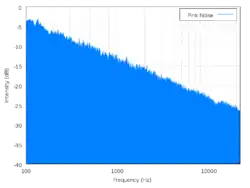 O ruído rosa caracteriza-se por manter a potência (energia) igual entre todas as oitavas sonoras (e também em qualquer outra escala logarítmica). Em termos de uma banda de frequência constante, o ruído rosa decai numa razão de 3 dB por oitava. Em altas frequências o ruído rosa nunca se torna dominante tal qual o ruído branco que possui energia constante em função da frequência (o ruído branco é rico na programação de altas frequências).