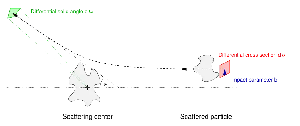 O parâmetro de impacto b é o deslocamento perpendicular a trajetória da partícula incidente e a partícula espalhada sai em um ângulo θ. Para uma dada interação (Coulombiana, magnética, gravitacional, etc. ), o parâmetro de impacto e o ângulo de espalhamento são proporcionais um ao outro. Geralmente o parâmetro de impacto não pode ser controlado nem medido evento a evento e é assumido que leva em conta todos os valores possíveis quando é tomada a média sobre muitos eventos espalhados. O tamanho diferencial da seção de choque é o elemento de área no plano do parâmetro de impacto, isto é, dσ = b dφ db. O alcance do ângulo diferencial da partícula espalhada num ângulo θ é o ângulo sólido dΩ = sin θ dθ dφ. A seção de choque diferencial é o quociente dessas quantidades, dσ/dΩ.
