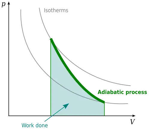 - Uma adiabata parece similar a uma isoterma, exceto que durante uma expansão, uma adiabata perde mais pressão que uma isotérma, então possui uma inclinação mais íngreme (mais vertical).