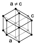 A célula unitária romboédrica para a rede hexagonal de Bravais é a célula centrada em D consistindo de dois pontos de rede adicionais que ocupam uma diagonal de corpo da célula unitária com coordenadas (13, 13, 13) e (23, 23, 23). No entanto, essa descrição raramente é usada.[4][5]