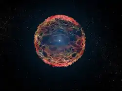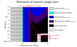 Estrelas muito massivas podem sofrer colapso do núcleo quando a fusão nuclear torna-se incapaz de sustentar o núcleo contra sua própria gravidade; ultrapassar esse limite é a causa de todos os tipos de supernova, exceto o Tipo Ia. O colapso pode causar a expulsão violenta das camadas externas da estrela, resultando em uma supernova, ou a liberação de energia potencial gravitacional pode ser insuficiente e a estrela pode colapsar em um buraco negro ou estrela de nêutrons com pouca energia irradiada.[75][76]