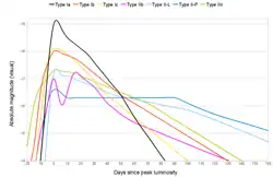Os astrônomos classificam as supernovas de acordo com suas curvas de luz e as linhas de absorção de diferentes elementos químicos que aparecem em seus espectros. Se o espectro de uma supernova contém linhas de hidrogênio (conhecidas como a série de Balmer na porção visual do espectro), ela é classificada como Tipo II; caso contrário, é Tipo I. Em cada um desses dois tipos, há subdivisões de acordo com a presença de linhas de outros elementos ou a forma da curva de luz (um gráfico da magnitude aparente da supernova em função do tempo).[45][46]