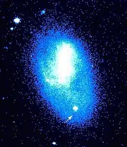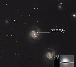 Os primeiros trabalhos sobre o que originalmente se acreditava ser simplesmente uma nova categoria de novas foram realizados durante a década de 1920. Estas eram chamadas de "Novae de classe alta", "Hauptnovae" ou "Novae gigante".[24] Acredita-se que o nome "supernovas" tenha sido cunhado por Walter Baade e Fritz Zwicky em palestras na Caltech durante 1931. Foi usado, como "super-novae", em um artigo de jornal publicado por Knut Lundmark em 1933[25] e em um artigo de 1934 por Baade e Zwicky.[26] Em 1938, o hífen havia se perdido e o nome moderno já estava em uso.[27] Como as supernovas são eventos relativamente raros dentro de uma galáxia, ocorrendo cerca de três vezes por século na Via Láctea, por exemplo,[28] a obtenção de uma boa amostra de supernovas para estudar requer o monitoramento regular de muitas galáxias diferentes. Supernovas em outras galáxias não podem ser previstas com nenhuma precisão significativa. Normalmente, quando são descobertas, já estão em andamento.[29] Para usar supernovas como velas padrão para medir distâncias, é necessária a observação de seu pico de luminosidade. Portanto, é importante descobri-las bem antes de atingirem seu máximo. Astrônomos amadores, que superam em muito os astrônomos profissionais, desempenharam um papel importante na descoberta de supernovas, normalmente olhando para algumas das galáxias mais próximas através de um telescópio óptico e comparando-as com fotografias anteriores.[30]