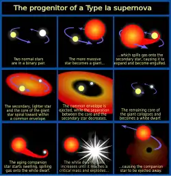 Uma anã branca pode acumular material suficiente de uma companheira estelar para elevar a sua temperatura de núcleo ao ponto suficiente para inflamar a fusão do carbono, momento em que ele sofre uma fusão nuclear de avalanche térmica. Existem três vias pelas quais essa detonação é teorizada para acontecer: a acreção estável de material de uma companheira, a colisão de duas anãs brancas ou a acreção que causa a ignição em uma concha que então incendeia o núcleo. O mecanismo dominante pelo qual as supernovas Tipo Ia são produzidas permanece obscuro.[54] Apesar desta incerteza, as supernovas Tipo Ia têm propriedades muito uniformes e são velas padrão úteis em distâncias intergalácticas. Algumas calibrações são necessárias para compensar a mudança gradual nas propriedades ou frequências diferentes de supernovas de luminosidade anormal em alto desvio para o vermelho e para pequenas variações no brilho identificadas pela forma da curva de luz ou espectro.[55][56]