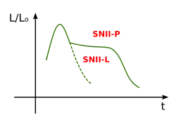 As supernovas do Tipo II com espectros normais dominados por linhas largas de hidrogênio que permanecem durante o declínio são classificadas com base em suas curvas de luz. O tipo mais comum mostra um "platô" distinto na curva de luz logo após o pico de brilho, onde a luminosidade visual permanece relativamente constante por vários meses antes de o declínio recomeçar. Estas são chamadas de Tipo II-P, referindo-se ao platô. Menos comuns são as supernovas do Tipo II-L que carecem de um platô distinto. O "L" significa "linear", embora a curva de luz não seja realmente uma linha reta. Supernovas que não se enquadram nas classificações normais são designadas como peculiares ou 'pec'.[46]