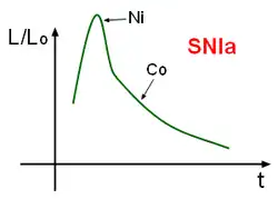 As supernovas do Tipo Ia seguem uma curva de luz característica - o gráfico da luminosidade em função do tempo - após o evento. Esta luminosidade é gerada pela decadência radioativa do níquel -56 ao cobalto -56 ao ferro -56.[63] O pico de luminosidade da curva de luz é extremamente consistente em supernovas normais do Tipo Ia, tendo uma magnitude absoluta máxima de cerca de -19,3. Isso ocorre porque as supernovas do Tipo Ia surgem de um tipo consistente de estrela progenitora por aquisição gradual de massa e explodem quando adquirem uma massa típica consistente, dando origem a condições e comportamento de supernova muito semelhantes. Isso permite que eles sejam usados como uma vela padrão secundária[65] para medir a distância até suas galáxias hospedeiras.[66]