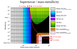 A tabela abaixo lista as razões conhecidas para o colapso do núcleo em estrelas massivas, os tipos de estrelas em que ocorrem, seu tipo de supernova associado e o remanescente produzido. A metalicidade é a proporção de outros elementos além de hidrogênio ou hélio, em comparação com o Sol. A massa inicial é a massa da estrela anterior ao evento da supernova, dada em múltiplos da massa do Sol, embora a massa no momento da supernova possa ser muito menor.[75]