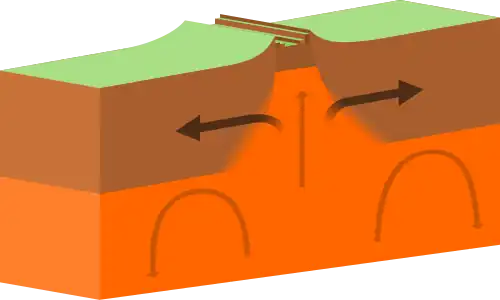 • Limites divergentes (limites construtivos ou limites extensionais). É quando duas placas deslizam e se afastam uma da outra. Em zonas de rifteamento entre oceanos, limites divergentes se formam pela expansão do fundo do mar, permitindo a formação de novas bacias oceânicas, por exemplo, a Dorsal Mesoatlântica e a Dorsal do Pacífico Leste. À medida que a placa oceânica se divide, a crista se forma no centro de expansão, a bacia oceânica se expande e, finalmente, a área da placa aumenta, com isso ocorre a formação de pequenos vulcões, fontes hidrotermais e/ou terremotos superficiais. Em zonas de rifteamento entre continentes, limites divergentes podem causar a formação de novas bacias oceânicas à medida que o continente se divide, se espalha, o rift central entra em colapso e o oceano preenche a bacia, por exemplo, o Rift da África Oriental.[17][18]