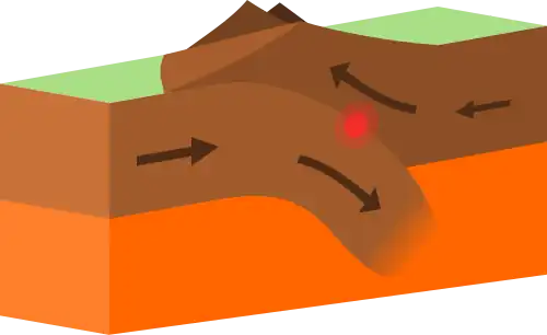 • Limites convergentes (limites destrutivos ou margens ativas) ocorrem quando duas placas deslizam uma em direção à outra para formar uma zona de subducção (uma placa se movendo por baixo da outra) ou uma colisão continental. As zonas de subducção são de dois tipos: subducção oceano-continente, onde a densa litosfera oceânica mergulha sob o continente menos denso, ou subducção oceano-oceano, onde a crosta oceânica mais antiga, mais fria e mais densa desliza sob a crosta oceânica menos densa. As fossas marinhas profundas são normalmente associadas a zonas de subducção.[17][18] Terremotos traçam o caminho da placa descendente conforme ela desce em direção à astenosfera, uma trincheira se forma e, à medida que a placa subduzida é aquecida, ela libera voláteis, principalmente água de minerais hidratados, no manto circundante. A adição de água diminui o ponto de fusão do material do manto acima da placa subductiva, fazendo com que ele derreta. O magma resultante normalmente leva ao vulcanismo.[19][17][18]