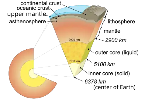 Diagrama da estratificação interna da Terra mostrando a litosfera acima da astenosfera (fora de escala) (em inglês)