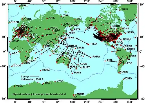 Movimento de placas baseado em dados de satélite do Sistema de Posicionamento Global (GPS) da NASA JPL . Cada ponto vermelho é um ponto de medição e os vetores mostram a direção e a magnitude do movimento.