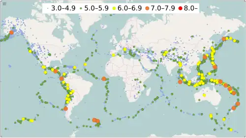 Durante o século XX, melhorias e maior uso de instrumentos sísmicos, como sismógrafos, permitiram que os cientistas aprendessem que os terremotos tendem a se concentrar em áreas específicas, principalmente ao longo das fossas oceânicas e das cristas oceânicas. No final da década de 1920, os sismólogos começaram a identificar diversas zonas proeminentes de terremotos paralelas às trincheiras, que normalmente eram inclinadas de 40 a 60° em relação à horizontal e se estendiam por centenas de quilômetros para dentro da Terra. Essas zonas mais tarde ficaram conhecidas como zonas de Wadati–Benioff, ou simplesmente zonas de Benioff, em homenagem aos sismólogos que as reconheceram pela primeira vez, Kiyoo Wadati do Japão e Hugo Benioff dos Estados Unidos. O estudo da sismicidade global avançou muito na década de 1960 com o estabelecimento da Rede Mundial Padronizada de Sismógrafos (WWSSN, sigla em inglês) para monitorar o cumprimento do tratado de 1963 que proíbe testes de armas nucleares acima do solo. Os dados muito melhorados dos instrumentos WWSSN permitiram que os sismólogos mapeassem com precisão as zonas de concentração de terremotos em todo o mundo.[54]
