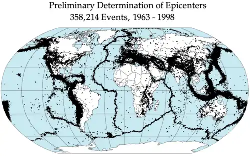Epicentros globais de terremotos, 1963–1998. A maioria dos terremotos ocorre em faixas estreitas que correspondem às localizações dos limites das placas litosféricas.