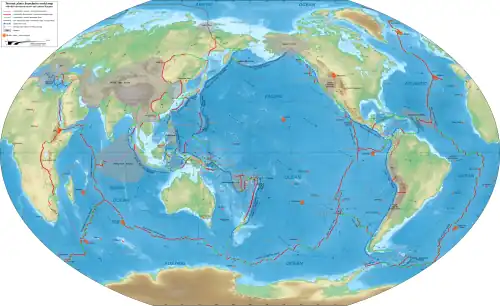 A litosfera da Terra, a camada externa rígida do planeta, incluindo a crosta e o manto superior, é dividida em sete ou oito placas principais (dependendo de como são definidas) e muitas placas menores ou "plaquetas". Onde as placas se encontram, seu movimento relativo determina o tipo de limite da placa (ou falha): convergente, divergente ou transformante. O movimento relativo das placas varia tipicamente de zero a 10 cm anualmente.[5] As falhas tendem a ser geologicamente ativas, sofrendo terremotos, atividade vulcânica, formação de montanhas e fossas oceânicas.