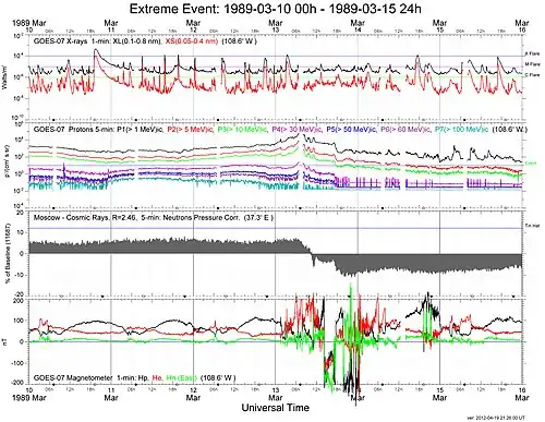 A tempestade geomagnética de março de 1989 causou o colapso da rede elétrica Hydro-Québec em segundos, quando os relés de proteção do equipamento dispararam em uma sequência em cascata.[3][17] 6 milhões de pessoas ficaram sem energia por 9 horas. A tempestade causou auroras tão ao sul quanto o Texas, Estados Unidos.[4] A tempestade que causou este evento foi o resultado de uma massa coronal ejetada do Sol em 9 de março de 1989.[18] O Dst mínimo foi de −589 nT.