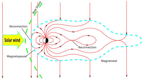 O vento solar também carrega consigo o campo magnético do Sol. Este campo terá uma orientação Norte ou Sul. Se o vento solar tiver rajadas energéticas, contraindo e expandindo a magnetosfera, ou se o vento solar assumir uma polarização para o sul, podem ser esperadas tempestades geomagnéticas. O campo para o sul causa a reconexão magnética da magnetopausa diurna, injetando rapidamente energia magnética e de partículas na magnetosfera da Terra.