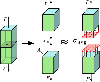 Na mecânica dos meios contínuos, tensão é uma medida da intensidade das forças internas agindo entre as partículas de uma seção transversal imaginária de um corpo de material deformável. Essas forças internas são forças de reação contra as forças externas aplicadas no corpo. Forças externas são ou forças de superfície ou forças de campo.[2] Como o corpo deformável carregado é admitido como contínuo, as forças internas são distribuídas continuamente por dentro do volume do corpo material, ou seja, a distribuição de tensões é expressa com uma função contínua de coordenadas espaciais e temporais.
