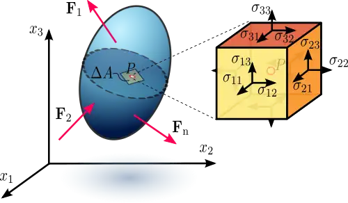 Considera-se um corpo submetido a tensão e se imagina um corte mediante um plano imaginário π que o divida em dois, sobre cada ponto do plano de corte se pode definir um vetor tensão tπ que depende do estado tensional interno do corpo, das coordenadas do ponto escolhido e do vetor unitário normal nπ ao plano π. Nesse caso se pode provar que tπ e nπ estão relacionados por uma aplicação linear T ou campo tensorial chamado tensor tensão: