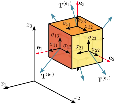 Figura 1. Tensão mecânica ou estresse: um tensor de segunda ordem. Os componentes do tensor, em um sistema tridimensional de coordenadas cartesianas, formam a matriz cujas colunas são as forças que atuam sobre as faces , , e do cubo