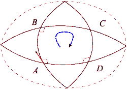 Uma ilustração da motivação da curvatura de Riemann em uma variedade tipo-espera. O fato desse transporte poder definir dois vetores diferentes no ponto inicial dá origem ao tensor de curvatura de Riemann. O símbolo de ângulo reto denota que o produto interno (dado pelo tensor métrico) entre vetores transportados (ou vetores tangentes das curvas) é 0.