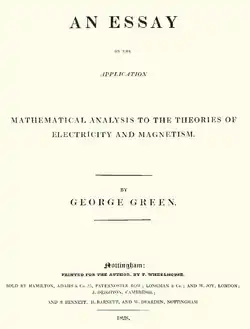 Folha de rosto do livro Essay on the Application of Mathematical Analysis to the Theory of Electricity and Magnetism, de 1828, em que se encontra a primeira demonstração do teorema de Green.