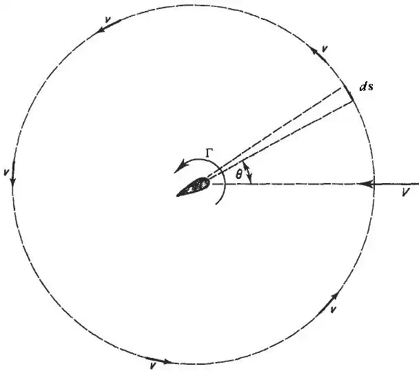 Para um argumento bastante heurístico, considere um aerofólio de pequena espessura de corda e envergadura infinita, movendo-se através do ar de densidade ρ. Suponha o aerofólio inclinado para o fluxo que chega para produzir uma velocidade V de um lado do aerofólio, e uma velocidade V + v no outro lado. A circulação então pode ser calculada como: