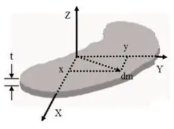Considere p como uma lâmina plana fina e uniforme. Considere sendo um elemento de massa com distância perpendicular de um eixo OZ perpendicular ao plano e passando através de um ponto O no plano.