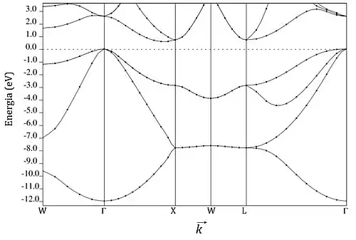 Além da análise de propriedades mecânicas, é possível utilizar a DFT para prever propriedades importantes como a estrutura de bandas, que tem permitido estudos nas áreas de materiais ferroelétricos, semicondutores magnéticos e eletroquímica. Na pesquisa de baterias recarregáveis, como as de lítio, a compreensão da relação entre as propriedades desses materiais em nanoescala e sua estrutura de bandas possibilita novos avanços na pesquisa de baterias de alta performance[19]. É possível gerar a estrutura de bandas e densidade de estados no processo de pós-processamento, a partir de informações obtidas pelos cálculos de DFT.