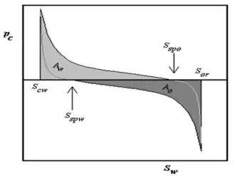 Estes dois índices são obtidos a partir de experimentos (placa porosa ou centrífuga) de análise especial de núcleo (SCAL, special core analysis) traçando a curva da pressão capilar como uma função da saturação de água como mostrado na figura 1: