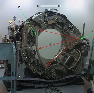 D: detectores de raio X; R: sentido de rotação; T: tubo de raio X; X: feixes de raio X