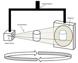A Tomografia computadorizada de feixe cônico (CTFC) também conhecida com tomografia computadorizada Cone Beam usa um feixe cônico de raios X com forma redonda ou retangular centralizado num sensor bidimensional para realizar uma varredura numa rotação de 360 graus ao redor da cabeça do paciente. Durante a varredura, uma série de 360 exposições ou projeções é adquirida, uma a cada grau da rotação, a qual fornece dados digitais para a reconstrução do volume exposto por algoritmo computacional.