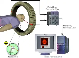 A imagem da PET é formada pela localização da emissão dos positrões pelos radionuclídeos fixados nos órgãos do paciente. Contudo como o positrão é a partícula de antimatéria do electrão, ele rapidamente se aniquila com um dos inúmeros electrões das moléculas do paciente imediatamente adjacentes à emissão, não chegando a percorrer nenhuma distância significativa. É assim impossível detectar os positrões directamente com o equipamento. Contudo, a aniquilação positrão-electrão gera dois raios gama com direcções opostas e cuja direcção e comprimento de onda podem ser convertidos na posição, direcção e energia do positrão que os originou, de acordo com as leis da física.
