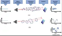 Como o movimento dessas bolsas variam com o tempo e com o espaço, o índice de refração seguirá um movimento aleatório, comportamento denominado Turbulento. Assim todos os feixes ópticos que atravessarem uma região com a presença de bolsas de ar quente sofrem desvios igualmente variantes no tempo e aleatórios. Esse tipo de efeito pode ser contornado, sistemas atuais de FSO (Free Space Optics) já utilizam técnicas de Auto alinhamento para mitigar os desvios.