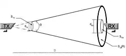 Atenuação por divergência de feixe: Devido à impossibilidade de obtenção de um feixe óptico perfeitamente colimado, a luz sofrerá um espalhamento e essa perda denominamos de atenuação por divergência do feixe. No projeto o cálculo dessa atenuação e feito a partir do ângulo de divergência oferecido pelo laser, ou seja quanto menor for esse ângulo maior será a distância alcançada. Esta divergência faz com que a área da seção reta do feixe aumente continuamente, e consequentemente apenas uma parcela da energia óptica transmitida será captada pelo receptor. Na figura abaixo, tem-se uma ilustração do cone de divergência e dos principais parâmetros utilizados no modelo de atenuação por divergência.