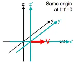 A notação abaixo descreve a relação sob a transformação de Galileu entre as coordenadas (x,y,z,t) e (x′,y′,z′,t′) de um único evento arbitrário, tal como medido em dois sistemas de coordenadas S e S′, em movimento relativo uniforme (velocidade v) com direções x e x’ comuns e com as suas origens espaciais coincidindo no tempo t = t′ = 0:[3][4][5][6]