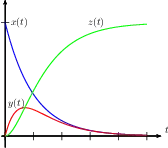 onde a concentração de R, S e T são dadas em mol/l por x(t), y(t) e z(t), respectivamente e são regidas pelo seguinte sistema de equações diferenciais ordinárias:onde α e γ são constantes positivas. Sabendo que as concentrações iniciais são dadas por: